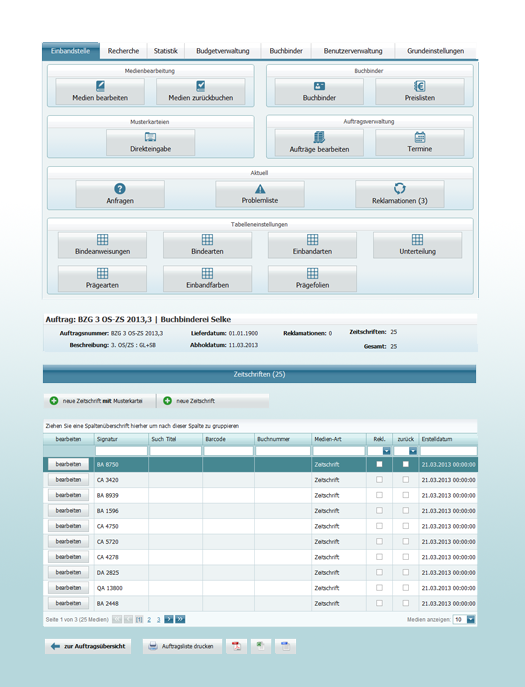 Webbasierte Einbandstellen-Verwaltung für Bibliotheken |